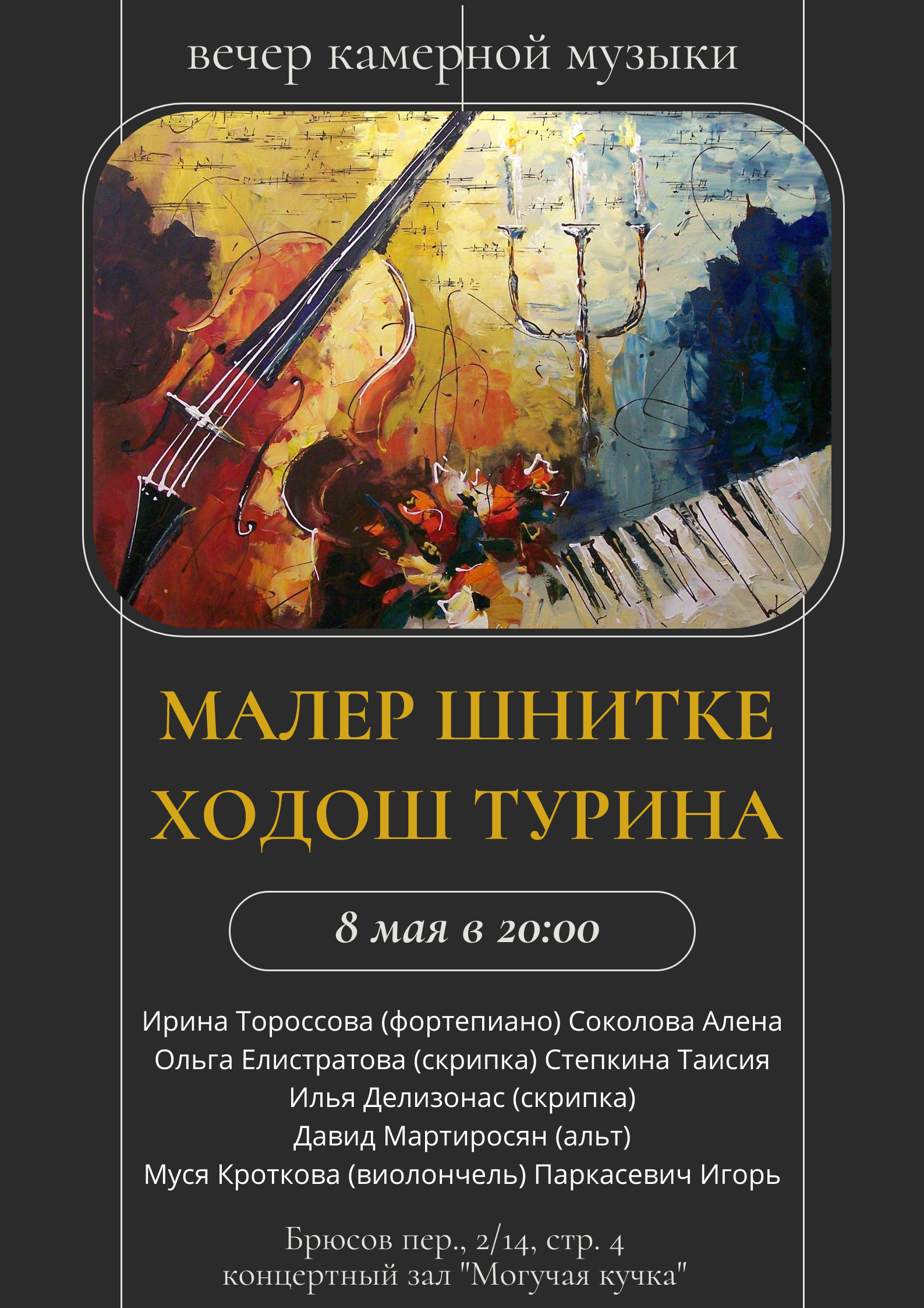 Исполняют: Ирина Тороссова (фортепиано), Ольга Елистратова (скрипка), Илья Делозонас (скрипка), Давид Мартиросян (альт), Муся Кроткова (виолончель), Алена Соколова (фортепиано), Таисия Степкина (скрипка), Игорь Паркасевич (виолончель)